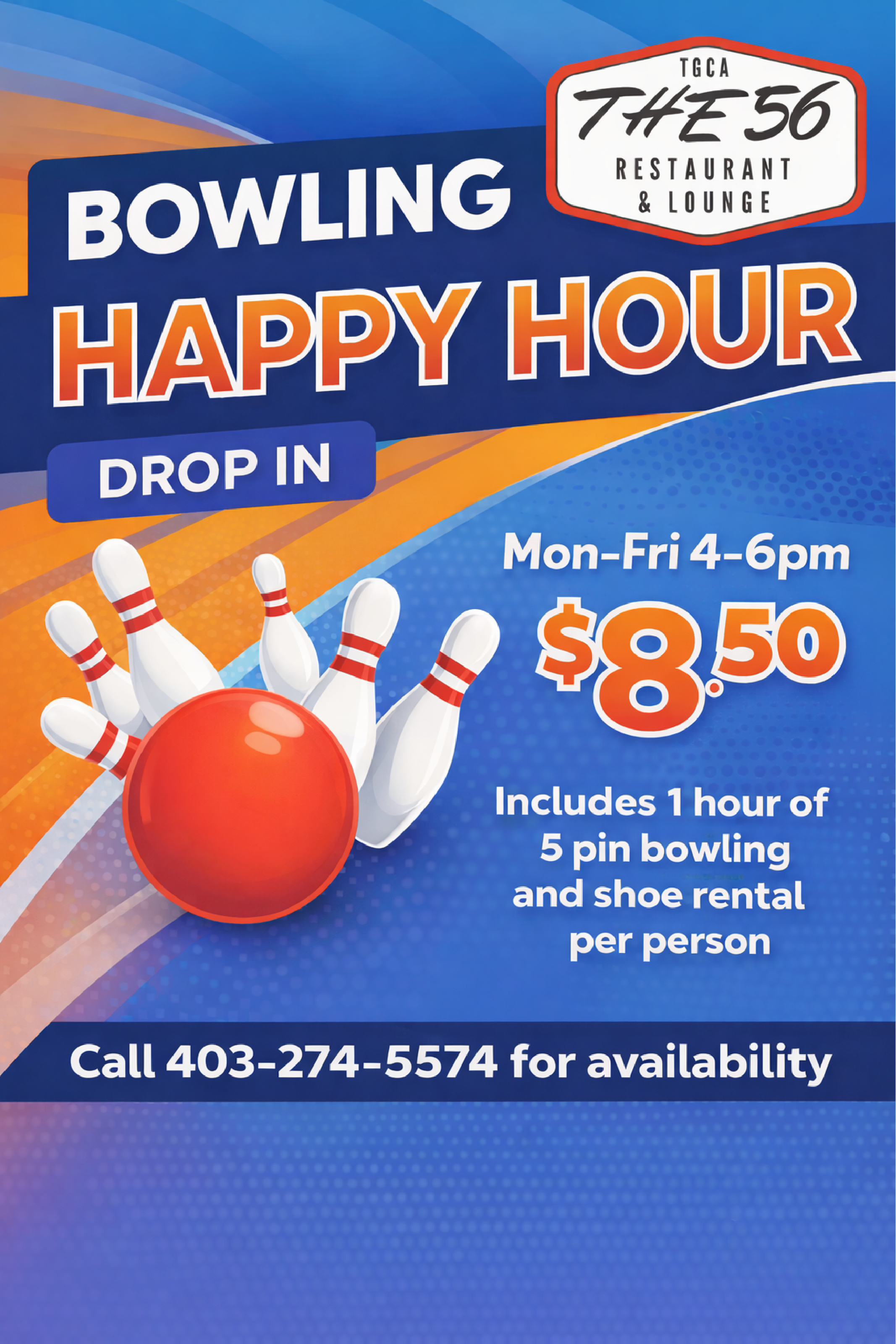 The 56 is a full-service restaurant and lounge where you can order from our comprehensive menu, or catch up over a cocktail or a coffee. Enjoy our family-friendly atmosphere, community spirit, great prices, good eats, and a variety of options for entertainment.