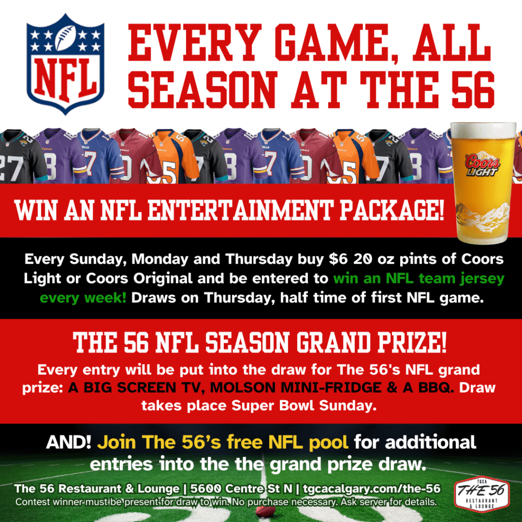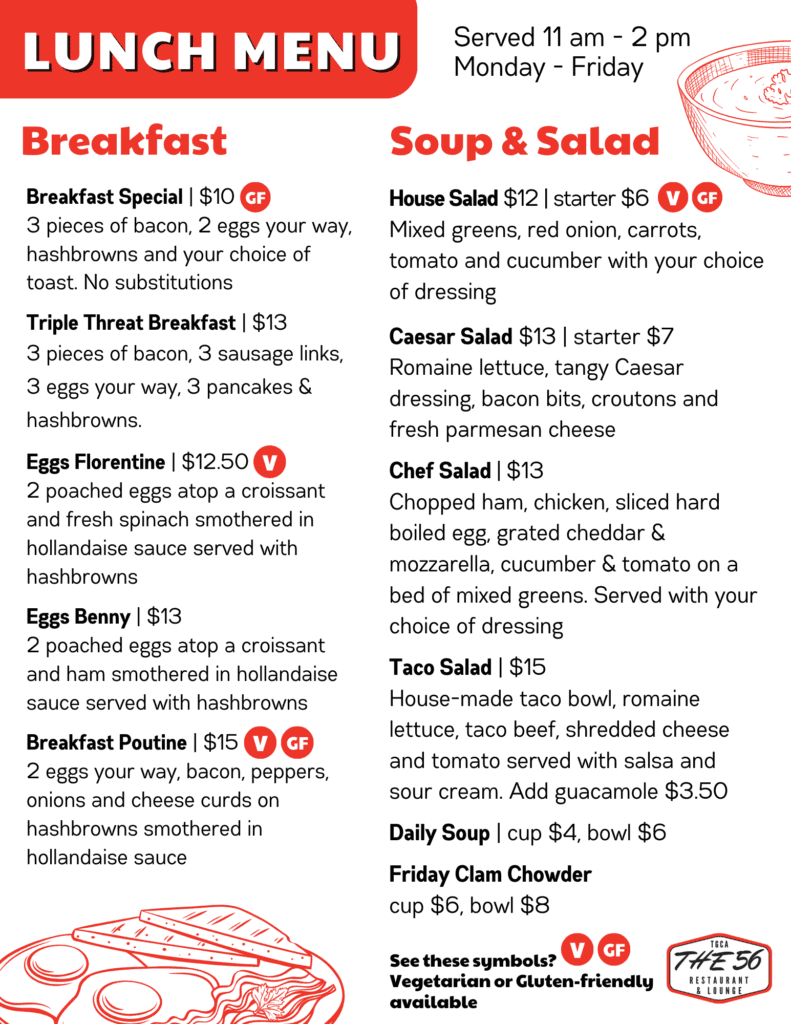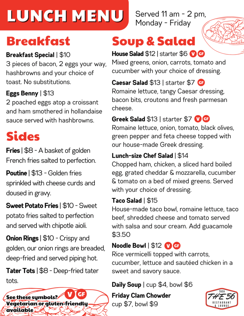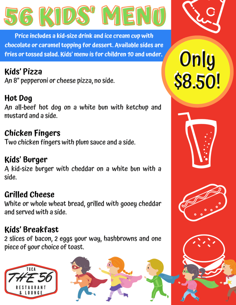 Our menu at The 56 is diner cuisine in a casual, sports pub setting, and we’ve got something to suit virtually every taste. Come by for some great lunch specials during the week or after the kids’ practice and have a hearty nosh. The kids’ menu has lots of options for even the pickiest of wee ones.