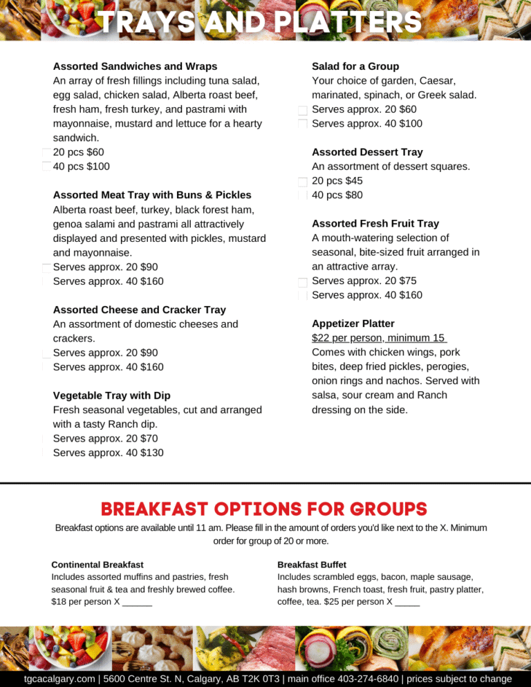 Contact Wendy, 587-393-7641, w.worth@tgcacalgary.com, to inquire about catering options.